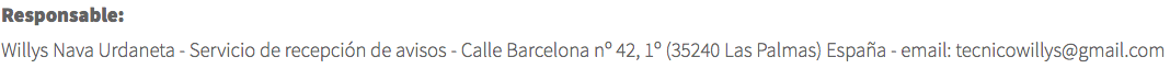 1. Todos los derechos de su contenido, textos son propiedad pertenecen a su propietario, exceptuando los nombres de las marcas, que pertenecen a sus legítimos propietarios legales y se mencionan sólo como ilustración. Algunos de los elementos de esta página, incluyendo sin limitaciones, su diseño y su contenido están protegidos por las leyes de la Propiedad Intelectual, Propiedad Industrial y tratados internacionales referidos a los Derechos de Autor. Esta página web no pertenece a ningún servicio técnico oficial de ninguna marca ni pretende, en ningún momento, suplantar a ninguna entidad, así como tampoco atendemos garantías. Los servicios que se ofrecen en el portal son únicamente central de recepción de llamadas, especializada en la reparación de electrodomesticos. Se debe considerar el uso de dichas marcas como publicidad comparativa en los términos establecidos en la directiva 2006/114/CEE del Parlamento Europeo y su Consejo, de fecha 12/12/06. 2. Uso de su Contenido Queda prohíbido reproducir, transmitir o copiar el contenido total o parte de esta web, a menos que sea explícitamente autorizado por escrito. reparaciondelavadoraslaspalmas.com.com autoriza a cualquier persona física o jurídica el establecimiento en sus páginas o sitios web de enlaces a éste, tanto a la página inicial como a cualquier otra de las páginas del sitio; excepto en el caso de que las páginas o sitios donde vaya a figurar el enlace tengan contenidos de carácter pornográfico, violento, xenófobo o ilegal de cualquier forma. Las nombres ajenos a este sitio, utilizados en él, pertenecen a sus propietarios legales y se mencionan simplemente como información. Por la navegación por cualquiera de las páginas web asociadas a este dominio y/o por la utilización de dichos servicios incluidos en las mismas, Vd. adquiere la condición de Usuario. Tanto la navegación como la utilización de cualquiera de los servicios ofrecidos suponen la aceptación como Usuario, sin reservas de ninguna clase, de todas y cada una de las presentes Condiciones Generales de Utilización de la Página Web. Para la utilización de nuestro sitio web es necesario la utilización de cookies. Ampliar la información en Politica de Cookies 3. Responsabilidades 3.1. Se pone el máximo esfuerzo en garantizar la precisión y exactitud del contenido de su página web, pero ésta puede contener errores o inexactitudes. Por lo que en el caso de que algún usuario detectase algún error se ruega se comunique a la propiedad de esta página para su subsanación inmediata. 3.2. Se rechaza la responsabilidad sobre la información contenida en páginas web de terceras partes conectadas por enlaces (links), con las páginas web de su propietaria. 3.3. No nos hacemos responsables bajo ninguna circunstancia del daño o perjuicio surgido por el uso indebido de esta página web, por personas ajenas a esta web. 3.4. Se prohíbe expresamente la copia o apropiación indebida de cualquiera de las páginas de este dominio, modificando cualquier dato o gráfico que conste en ellas, pudiendo solicitar de forma expresa al infractor la eliminación de la misma allá donde aparezca, y en caso de no ser atendida su solicitud, hacerlo de forma judicial. 4. Modificaciones Nos reservamos el derecho a cambiar cualquier parte del contenido de esta página web, en cualquier momento y sin aviso previo. 5.1. Tratamiento de sus datos personales Al objeto de procesar su pedido o presupuesto, requerimos nos faciliten de manera telefónica ciertos datos personales como el nombre, dirección, teléfono los cuales serán tratados para ofrecerle el servicio requerido, quedando sobreentendido que nos autoriza expresamente a que dichos datos sean archivados en los ficheros por 3 meses, igualmente autoriza la cesión revocable con la misma finalidad. En cumplimiento de lo establecido en la Ley Orgánica 15/1999, de 13 de diciembre, de Protección de Datos de Carácter Personal, le informamos que sus datos personales quedarán incorporados y serán tratados en un fichero automatizado titularidad del propietario de este dominio con la finalidad de poder gestionar su solicitud. El tratamiento y gestión de los mismos cumple lo estipulado en el Real Decreto 994/1999, de 11 de junio, por el que se aprueba el reglamento de medidas de seguridad de los ficheros automatizados que contengan datos de carácter personal. 5.2. Tomamos todas las medidas necesarias para proteger la confidencialidad de su información personal. Únicamente empleados autorizados tienen acceso a las bases de datos que almacenan información del usuario. 6. Solicitud de Servicio Para solicitar algún servicio promocionado por el Responsable del portal web el usuario deberá aportar en su llamada telefónica, o formulario ciertos datos imprescindibles para llevar a cabo su solicitud. Le informamos que los datos que nos facilita podrán ser cedidos a la empresa Colaboradora, si fuese necesario, para proceder con su solicitud. Sus datos serán tratados dentro de la normativa vigente de Protección de Datos de carácter personal (LOPD). Al dar uso a nuestros servicios usted están aceptando expresamente la comunicación de los mismos, por cualquier medio. Usted tiene derecho a recibir respuesta de cualquier pregunta, consulta o aclaración que le surja derivada de nuestro portal web y servicios. El Usuario garantiza que los datos aportados son verdaderos, y actualizados, y serán los únicos responsables de cualquier daño o perjuicio, directo o indirecto, que pudiera ocasionarse como consecuencia del incumplimiento de tal obligación. En el caso de que los datos aportados por un Usuario pertenecieran a un tercero distinto de quien facilita los datos, el Usuario deberá informar al tercero de los aspectos contenidos en esta Política y obtener su autorización para facilitar sus datos al Responsable del portal web. En el supuesto de que la solicitud fuera solicitado por una entidad jurídica, el con